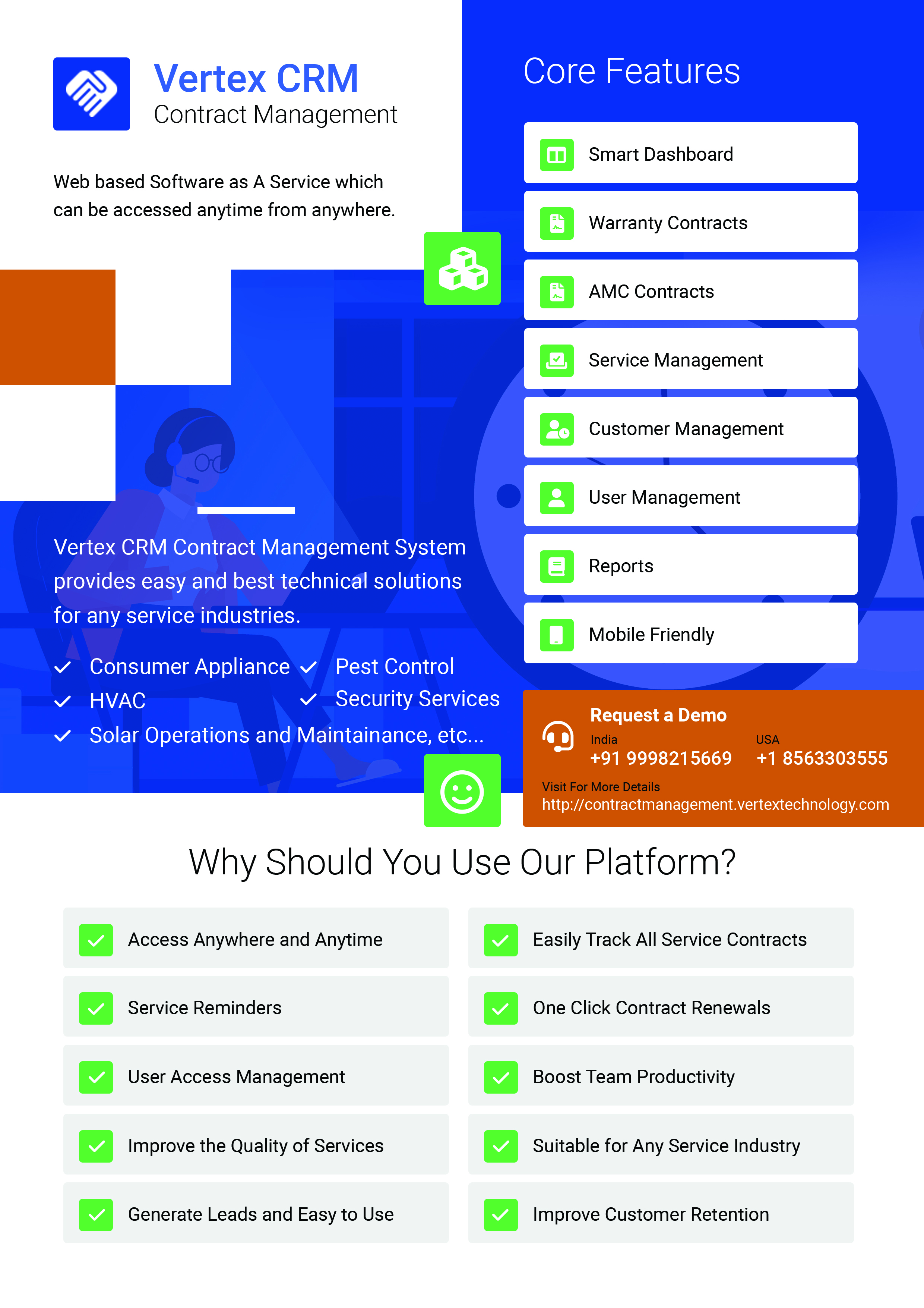 Contract Management Software is web based Software which is available as Software As a Service (SaaS) on Subscription basis. This software developed by Vertex Technologies can be used for management of various types of contracts and services offered by Most of the service based industries like Mechanical /Electronic/ Electrical / Software / Automobile etc. This software helps small and medium scale industries to manage the AMC Contract, Warranty Contract, Services and Installations for the products they offer and may need regular or on call based services or Installations. It also provides leads about their customer’s data regarding who do not have contracts so that they can try to offer them annual contracts and can generate more business for them.